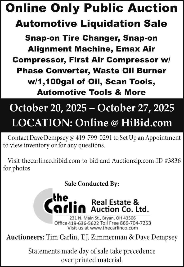 Ads for The Carlin Real Estate And Auction Co. in Bryan, OH