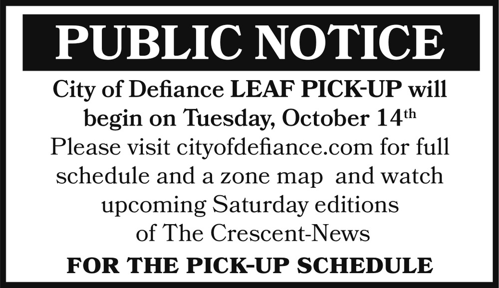Oct 09, 2025. City of Defiance - Leaf Pick-Up Schedule Government Ads from The Crescent News