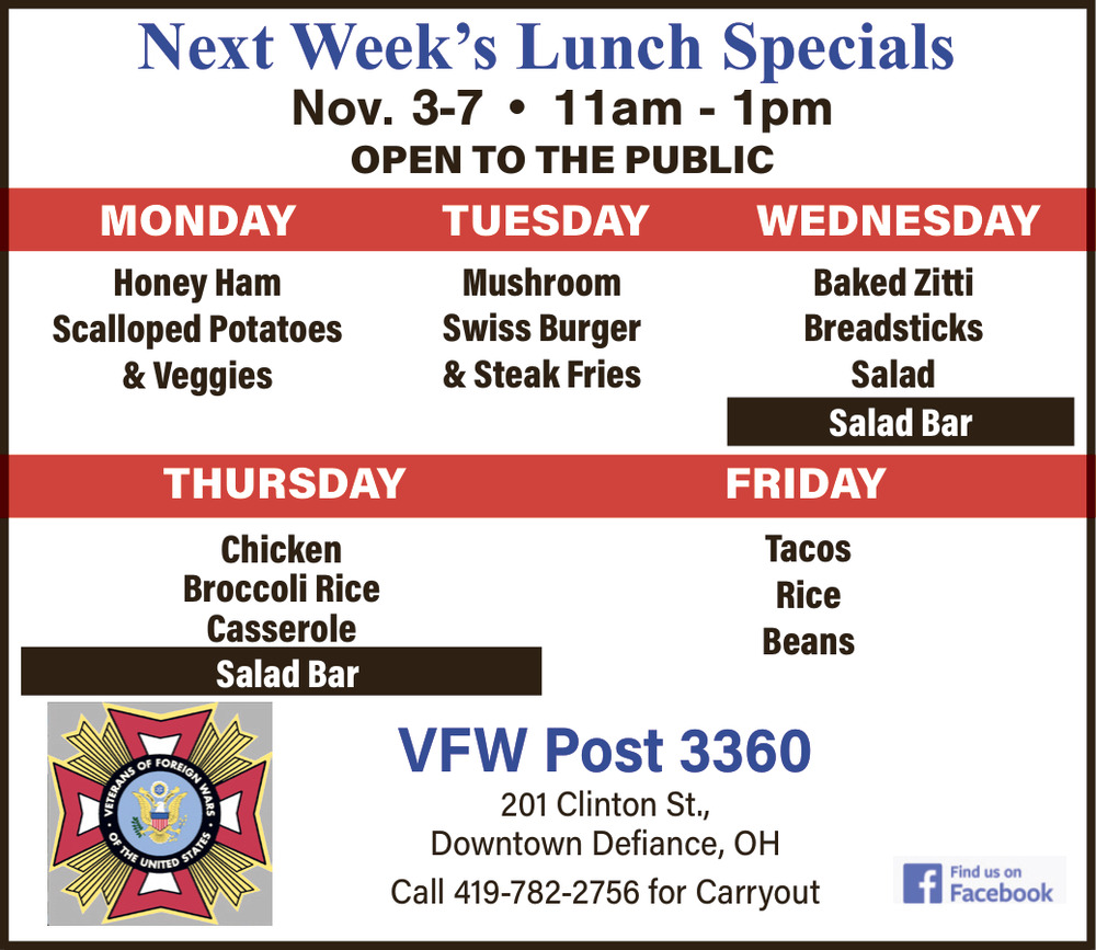 Nov 01, 2025. VFW Post 3360 Restaurants Ads from The Crescent News