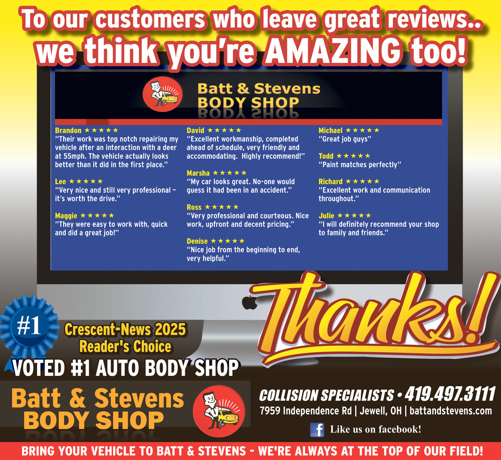Ads for Batt & Stevens Body Shop in Northwest Ohio