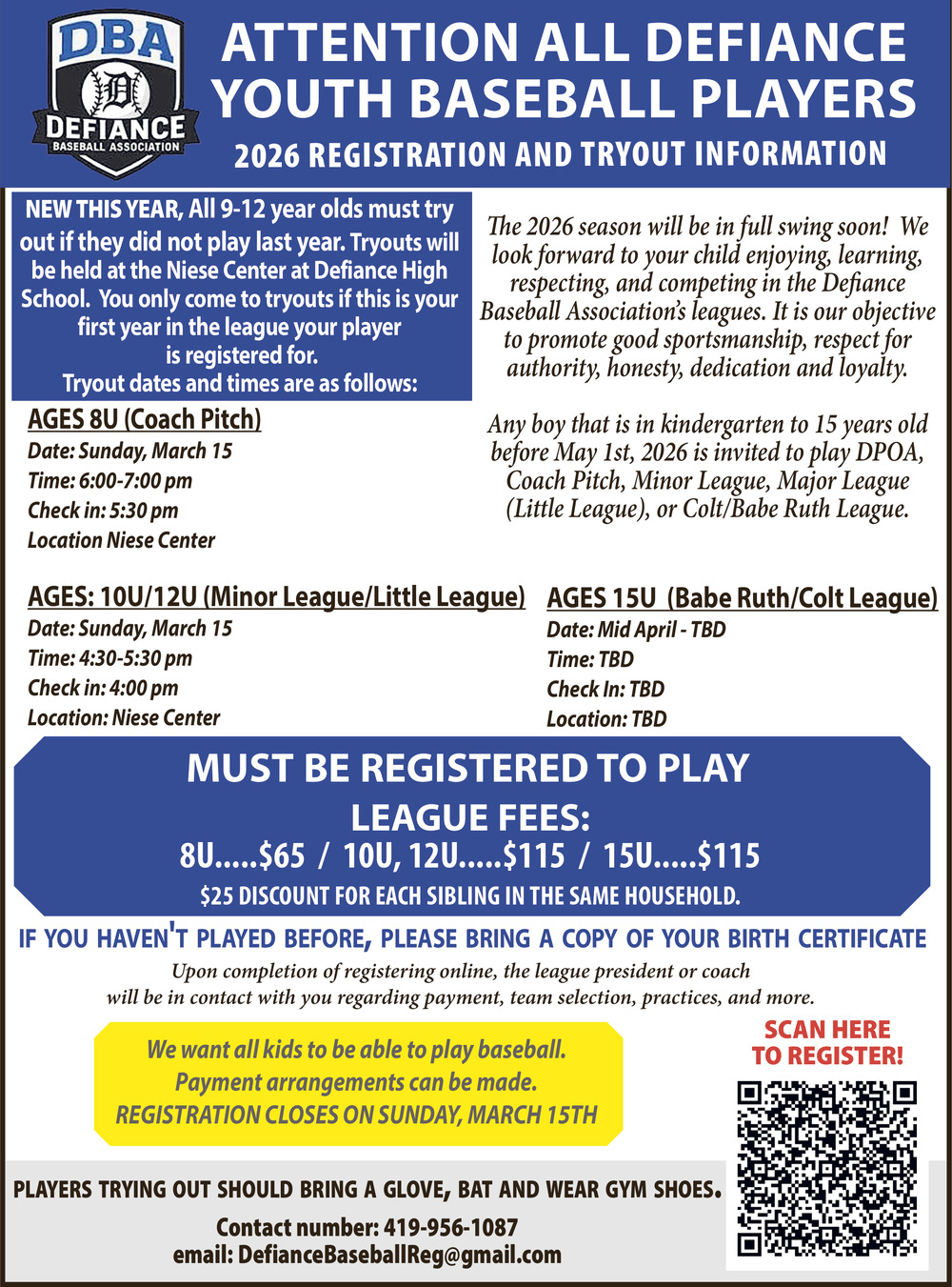 Attention All Defiance Youth Baseball Players