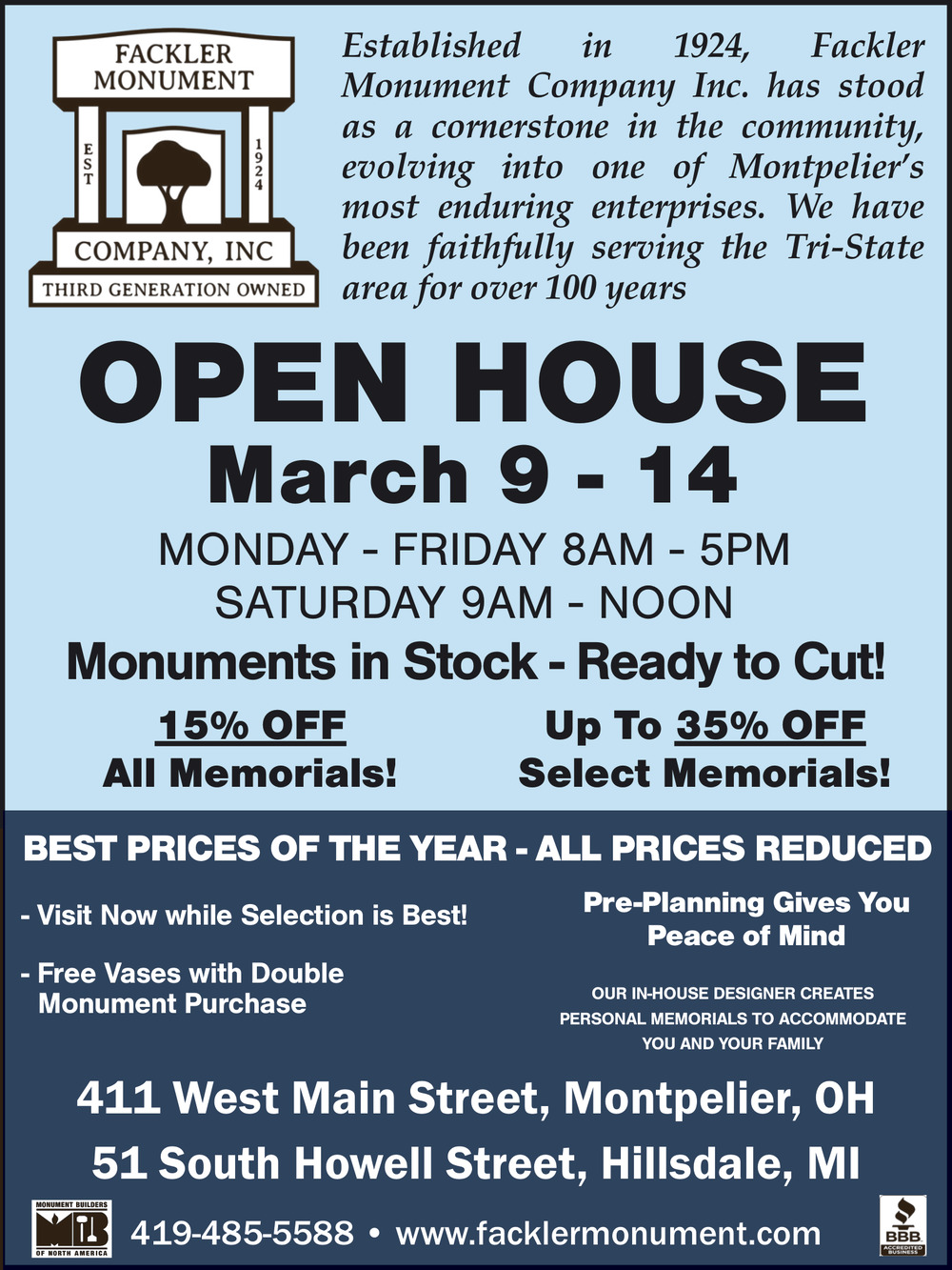 Ads for Fackler Monument Company in Montpelier, OH