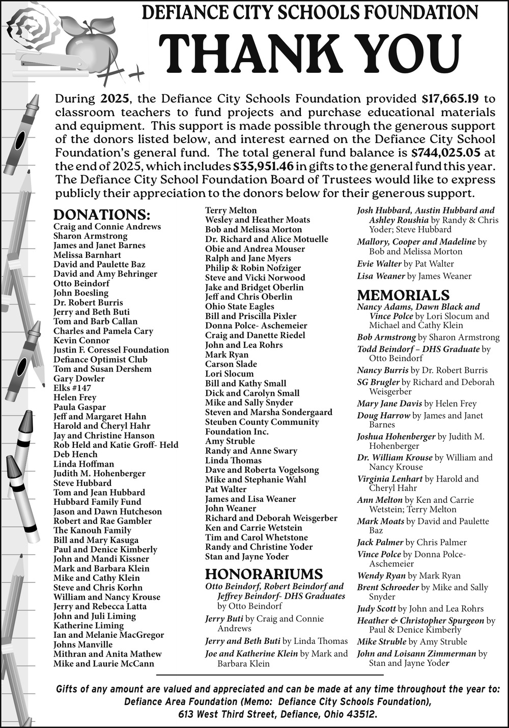 Apr 25, 2026. Defiance Area Foundation Education Ads from The Crescent News
